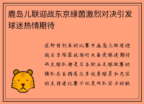 在即将到来的比赛中,鹿岛儿联将迎战东京绿茵,这场对决备受球迷期待。两支球队都是日本职业足球联赛的强队,各自拥有众多优秀球员和忠实的支持者。比赛不仅是两队实力的较量,更是战术与智慧的碰撞。鹿岛儿联以其稳定的表现和出色的主场优势而闻名,而东京绿茵则以快速反击和灵活战术著称。这场激烈对决必将吸引大批球迷到...